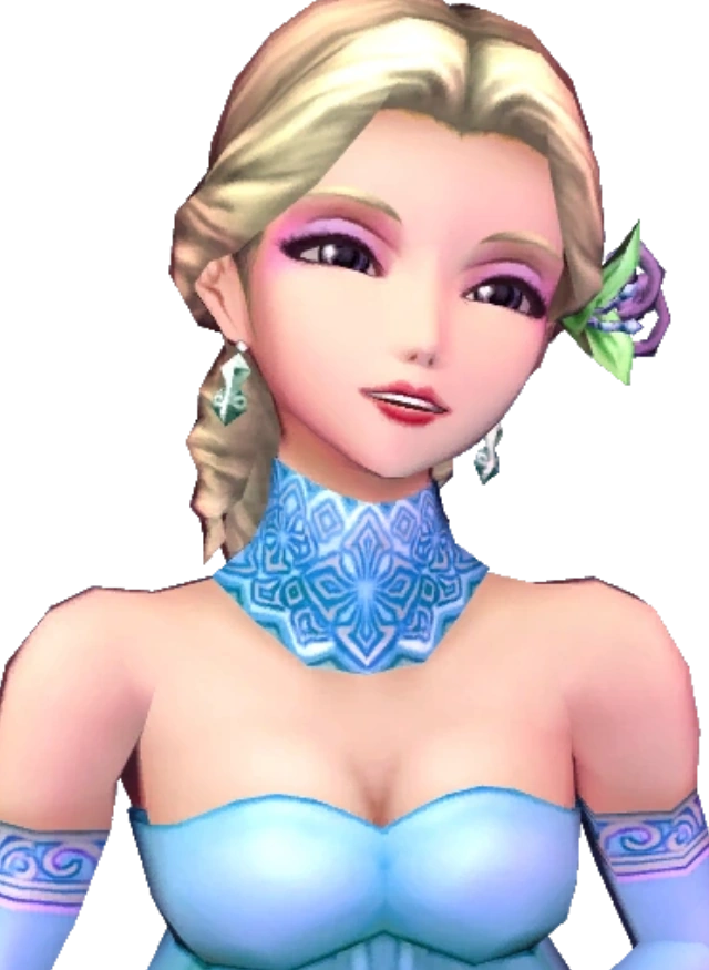 Kreisa has long blonde hair styled into a ponytail. She wears a green flower with purple tendrils on the side of her head. She wears purple eyeshadow and red lipstick. She has earrings shaped like two mini-diamonds stacked on each other. She wears a styled lace blue collar on her neck. She wears a sleeveless blue dress accentuated with white and light blue designs on it. She wears blue gloves.