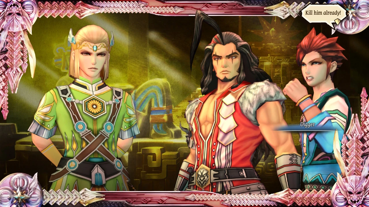 Just as with Urpina, Sigfrei is found over several regions spreading discord; Sigfrei's interactions remain mostly the same. The difference is that if the scenario is played early, instead of ending in the temple of Marigan is Azhuacan, it ends in the temple of Macha.