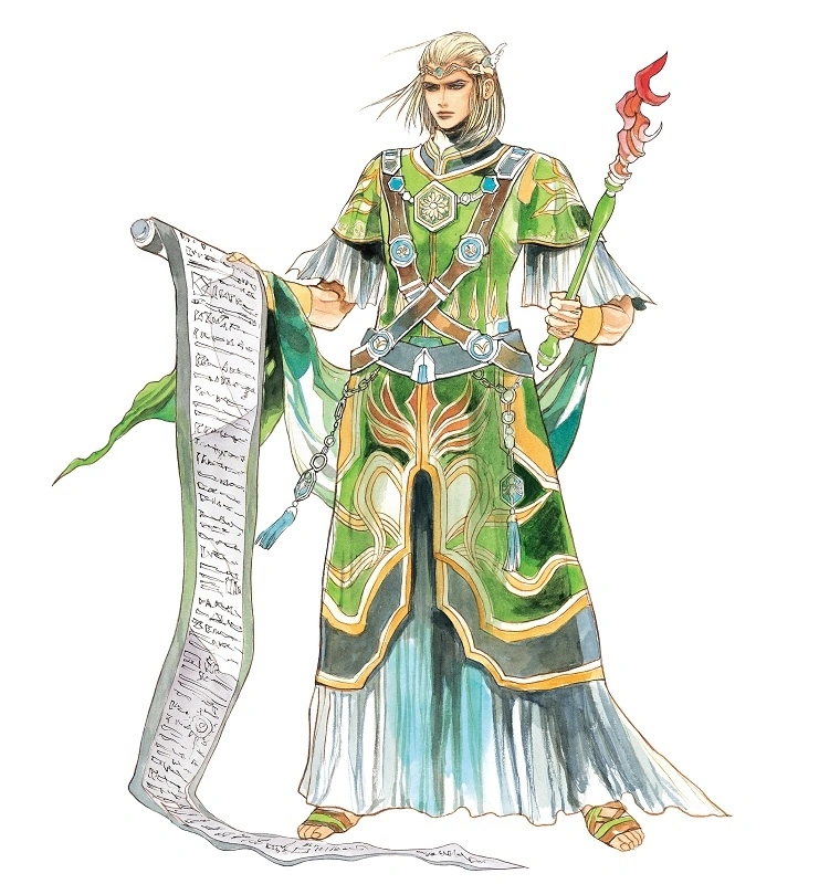 Sigfrei is depicted as a young blonde-haired man clad in a green vest over a white robe. A notable difference between his in-game counterpart and his artwork depiction is that in-game the robe appears to be rather a set of two pieces: a shirt and long white pants. In combat he's usually seen wielding a Quarterstaff.